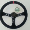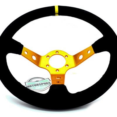 schwarzes Wildleder Sportlenkrad 350mm tief geschüsselt mit goldenem Lenkradtopf und gelber Markierung