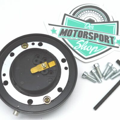 Motorsport Snap-Off Verschluss in schwarz eloxiert! Verschraubung auf Nabe mit 6x70mm, Doppellochkreis von Lenkradmontage mit 6x70mm und 6x74mm. Also für die meisten Sportlenkräder passend. Extra dünne Ausführung mit 25mm Dicke des abnehmbaren Lenkradverschlusses. Andere Ausführungen auf Anfrage. Hupenfunktion kann weiter verwendet werden.